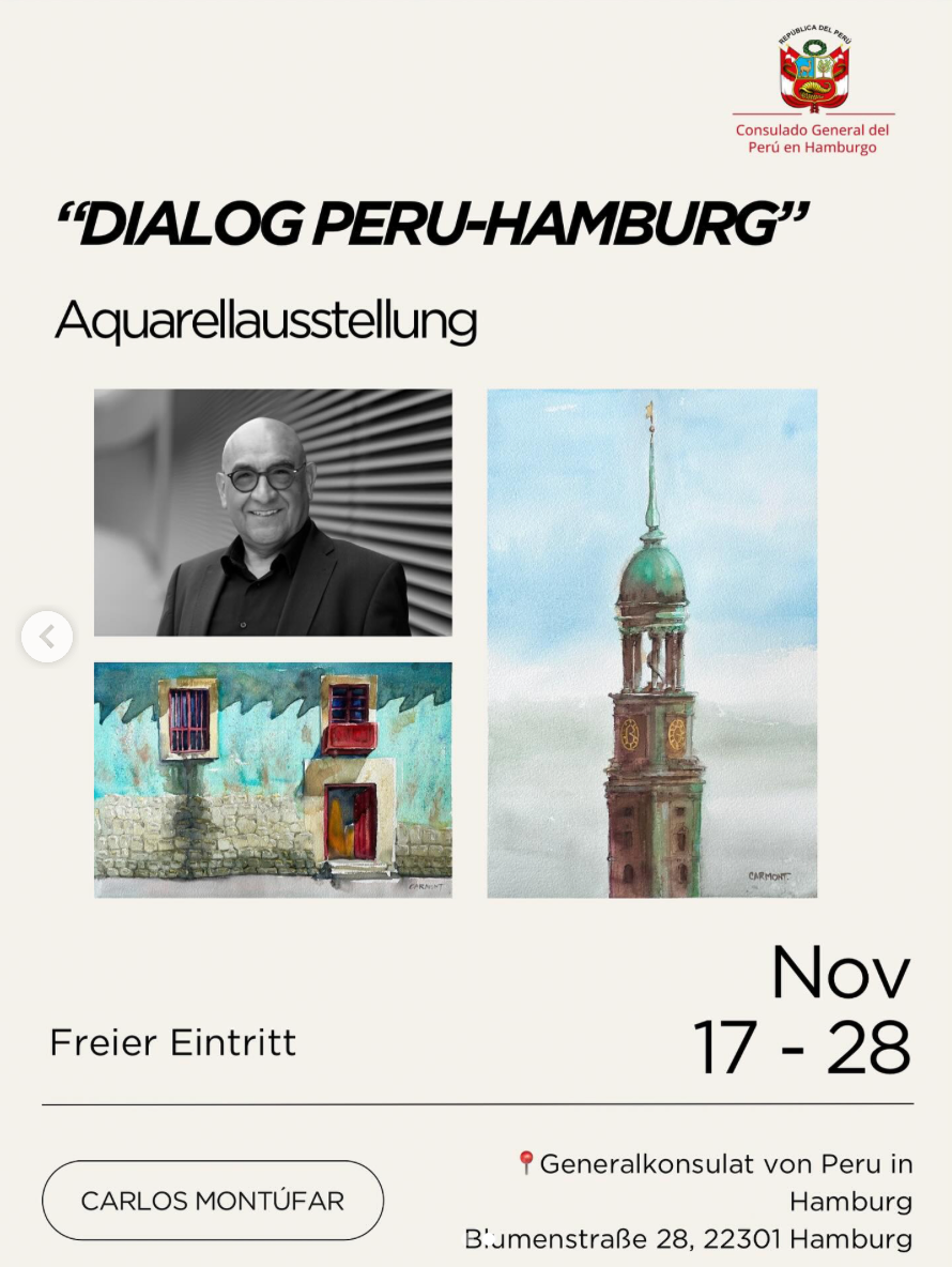 Das Generalkonsulat von Peru in Hamburg lädt herzlich zur Aquarellausstellung „Dialog Peru – Hamburg“ ein – eine Begegnung der Kulturen, die durch Farbe, Wasser und künstlerische Sensibilität verbunden wird.